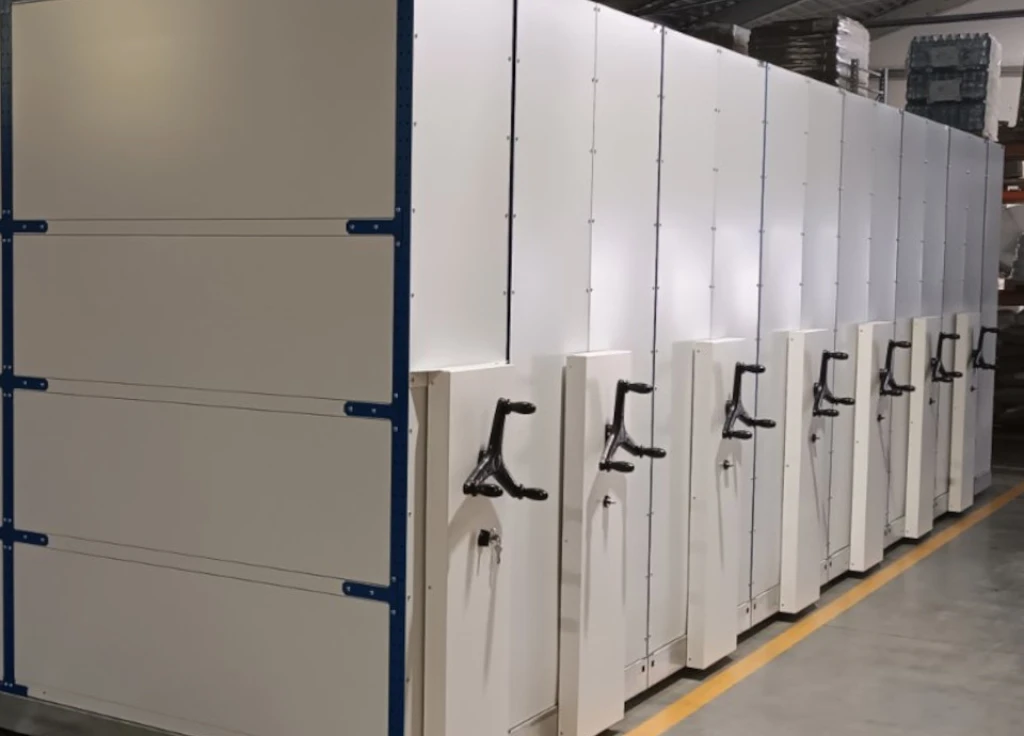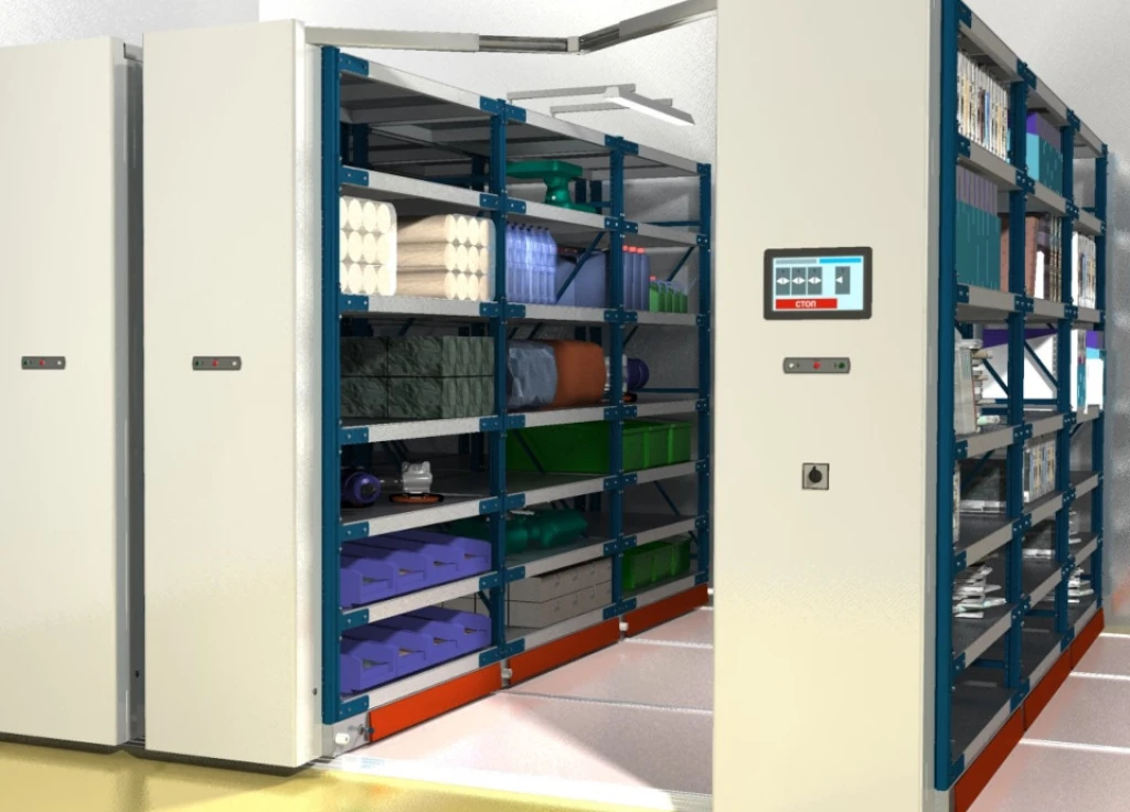 Среднегрузовые передвижные стеллажи закрывающиеся дверями жалюзи для склада, цеха или производства.