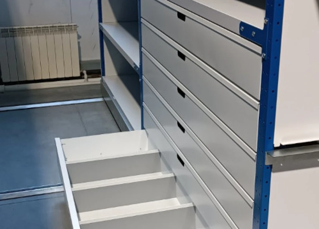 Среднегрузовые стеллажи с выдвижными ящиками для хранения мелких деталей, запчастей, метизов. Могут иметь ячейки. Используются на складе или производстве.